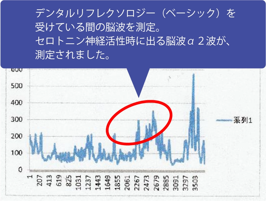 下図は、デンタルリフレクソロジーの施術中の脳波です。α2波が測定されてセロトニンが活性されたことを示します。