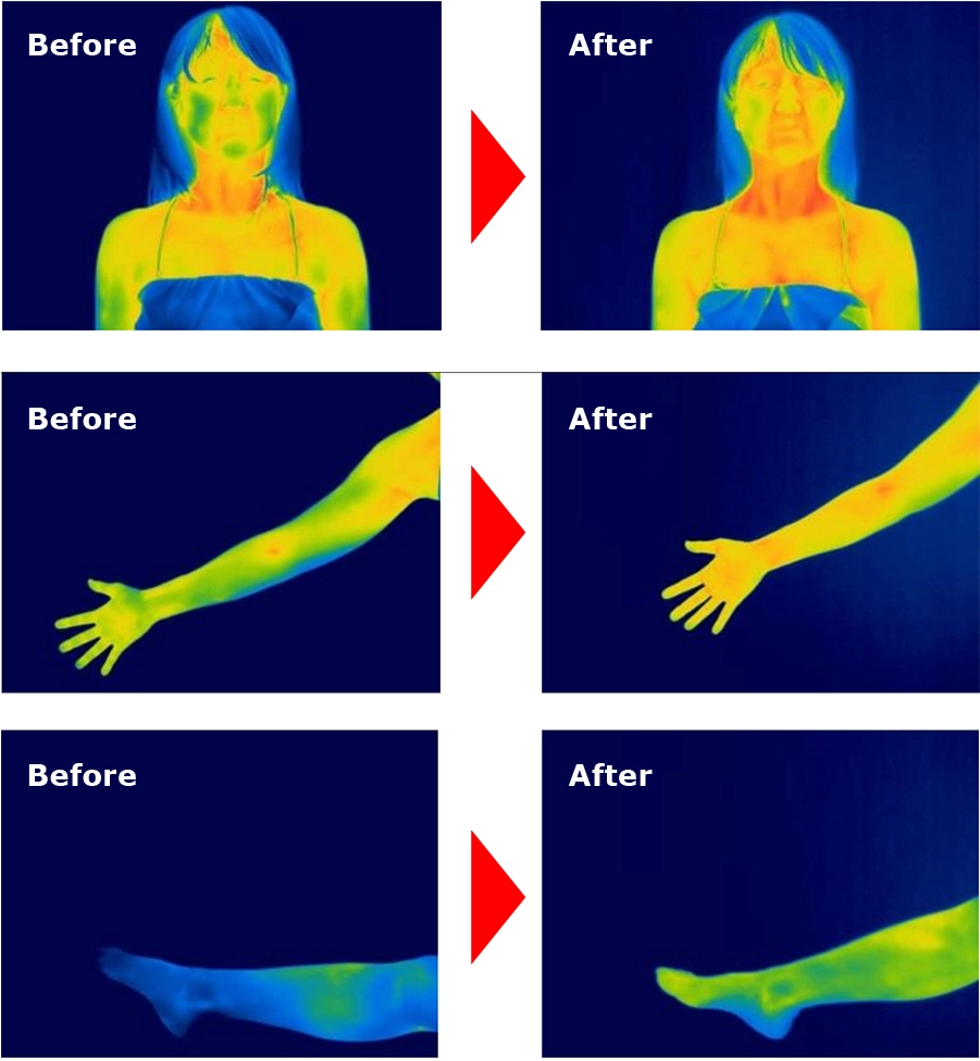 下図サーモグラフィ参照。足の先まで体温上昇しています。